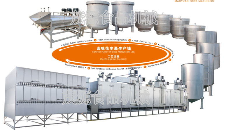 鹵味花生果生產(chǎn)線主要由:洗果機(jī)、煮鍋、吊籠、入味鍋、料液罐、多功能連續(xù)烘烤爐,以及烘烤池等設(shè)備組成。