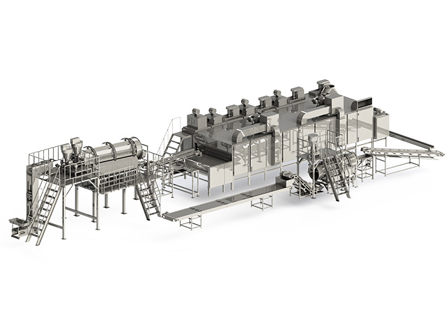 簡(jiǎn)介:采用噴淋、涂層、鍍膜工藝及多層調(diào)味技術(shù),從溶液、前粉、后粉三部分來(lái)進(jìn)行調(diào)味,產(chǎn)品口感更加豐富立體。裹衣單元中噴淋設(shè)備內(nèi)部獨(dú)特的結(jié)構(gòu),大大提高了原輔料的接觸機(jī)會(huì),裹衣效果更加均勻,降低了產(chǎn)品的次品率。堅(jiān)果仁原料以及半成品通過(guò)傳送帶運(yùn)輸,依次經(jīng)過(guò)提升機(jī)進(jìn)入主要加工設(shè)備——連續(xù)式淺粉涂裹設(shè)備,然后進(jìn)行油炸/烘烤,進(jìn)行二次裹粉調(diào)味后再進(jìn)入冷卻,再進(jìn)行包裝,全自動(dòng)化連續(xù)作業(yè)提高生產(chǎn)效率,保證產(chǎn)品品質(zhì)。