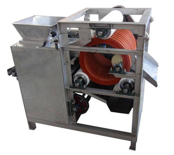 將經(jīng)浸泡的蠶豆倒入料斗,經(jīng)震動(dòng)進(jìn)料使原料進(jìn)入由三個(gè)動(dòng)力輥固定的旋轉(zhuǎn)膠輪之間的夾縫,在進(jìn)料輪的作用下,經(jīng)過(guò)刀片將原料外皮切口,然后由出料輪排出。